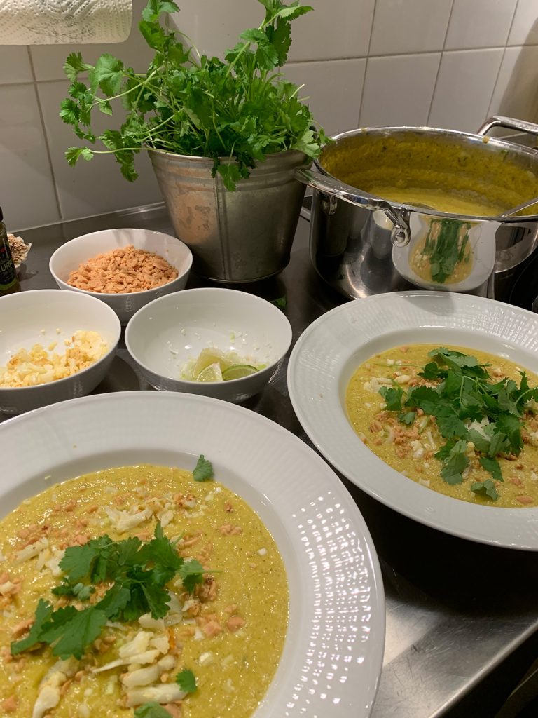 Servera och toppa med blomkål, jordnötter, purjolök, och koriander.